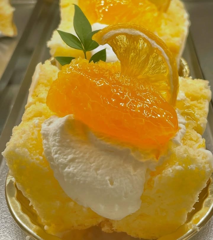ふわふわレモンフォン生地にレモンチョコ、生クリーム、オレンジ、乾燥させたレモンを飾って仕上げました。