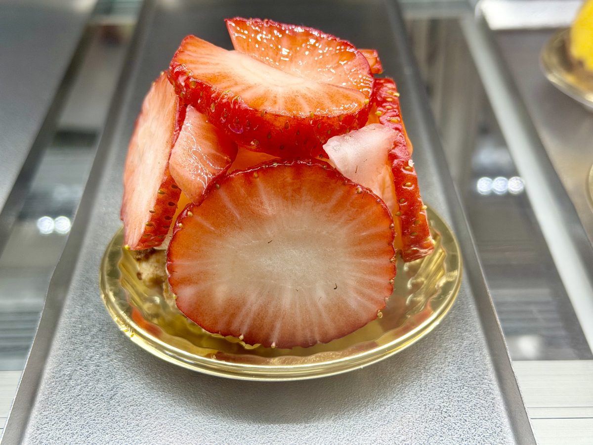 パイタルト生地に、カスタード、生クリーム、スライス苺をドーム状に張り付けて仕上げました。