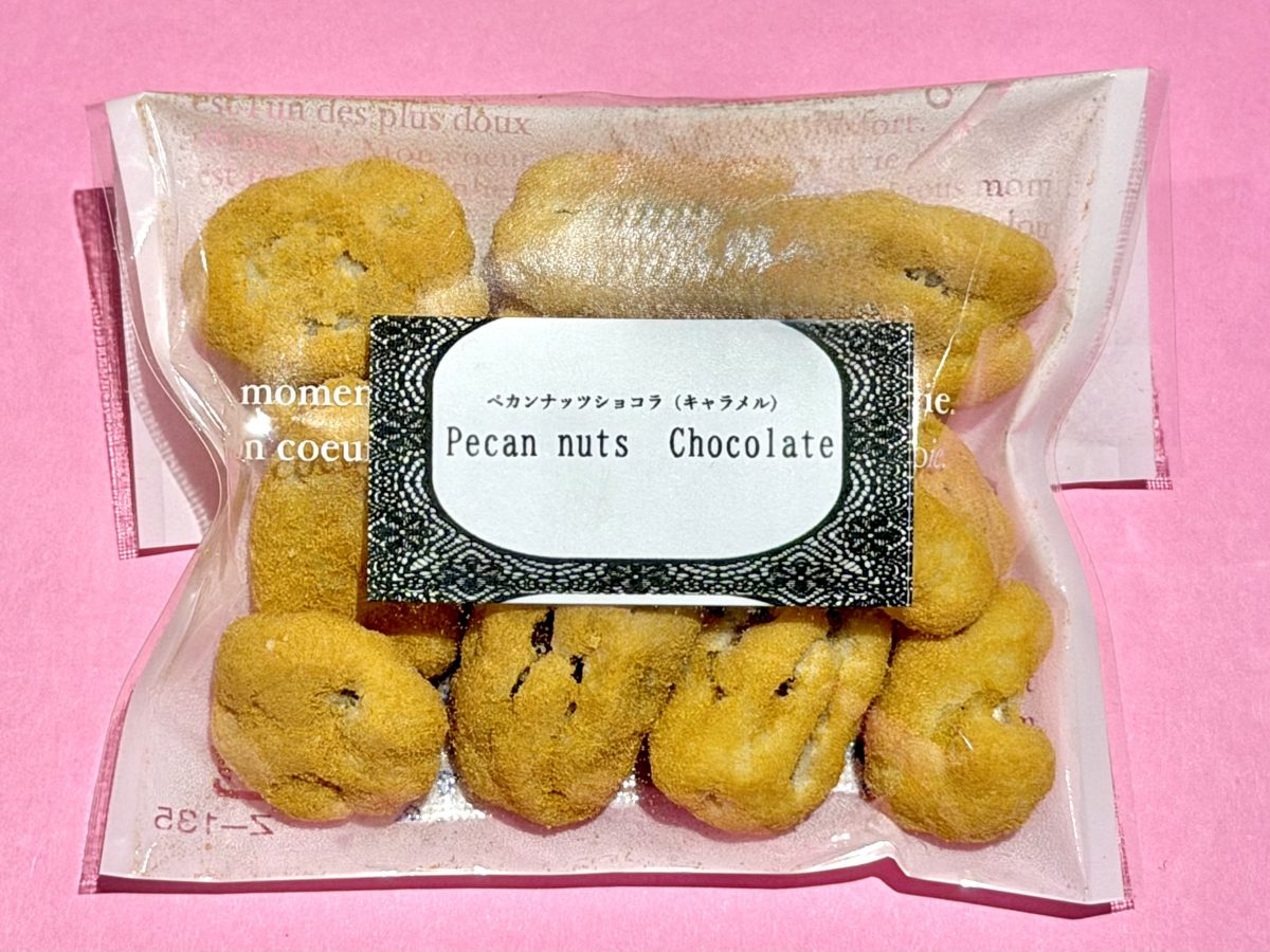 ローストしたペカンナッツをホワイトチョコレートとキャラメルパウダーで包みました。
